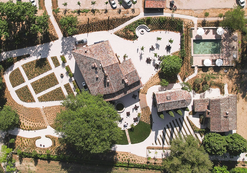 酒店场地中心是一个户外广场,包含带有遮阳伞的座位、喷泉和小教堂,可供举办晚宴、灯光装置秀、舞蹈派对和庆典等等。在教堂后方,30米长的铁制廊架和开满鲜花的庭院,各种休闲区依次在整个场地中铺展开来,并通过一系列种植着迷迭香和古老橡树的路径相互连接在一起。
