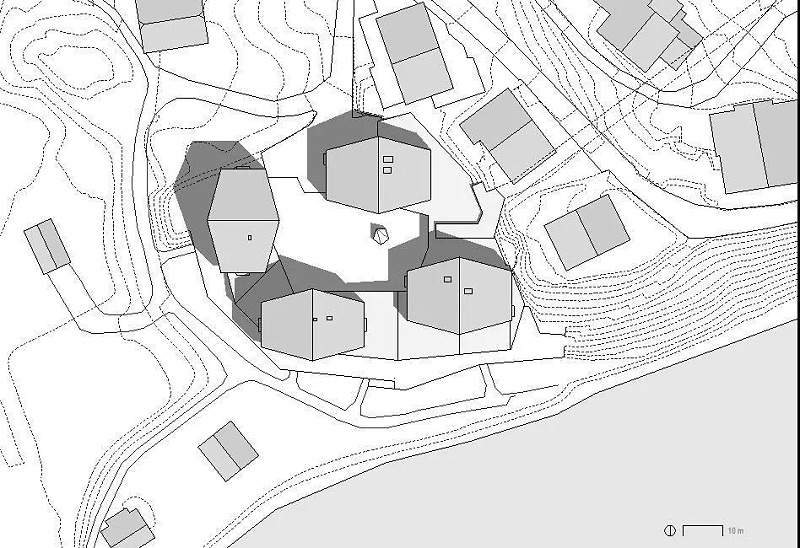 据亿伽酒店设计了解,这座建筑院落就坐落在一个湖旁,高处瑞士山区,海拔约1900米。梅尔希湖-弗鲁特(Melchsee-Frutt)小村庄是滑雪区的最高站,冬季只有小型缆车才能到达。结晶的立方体标出了村庄和湖泊之间的边缘。