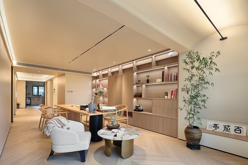 该项目在建筑细部设计上,不追求建筑的曲线、折线,而在用材、色彩上追求社区时尚的语言。主打原木色成就空间基调,在现代极简主义风的融入下,摒弃多余色调,还原一个真正意义的极简美学空间。客厅采用大量原木色定下自然感十足的空间基础。由浅米色布艺沙发配合黑色简约原木茶几,凸显出色调的对比关系。大客厅旁边的落地窗,巧妙引入适当光线,增加了通透视线感。餐厨处于相同空间,通过开放式格局提升视线体验感。专门在直角位置设计倒角式处理,添增空间的柔和度。厨房和厨柜皆取用原木材料配大理石墙面,达成统一平衡效果,餐桌无太多矫情装饰只为彰显现代极简主义的新格调。卧房和盥洗室遵循极简设计布局,沿用原木色和纯白色当主基调,混搭多样材料装饰设计,充分呈现空间的精致和美感通过相同色系的床品装饰空间,呈现一种东方寂静的艺术美感。